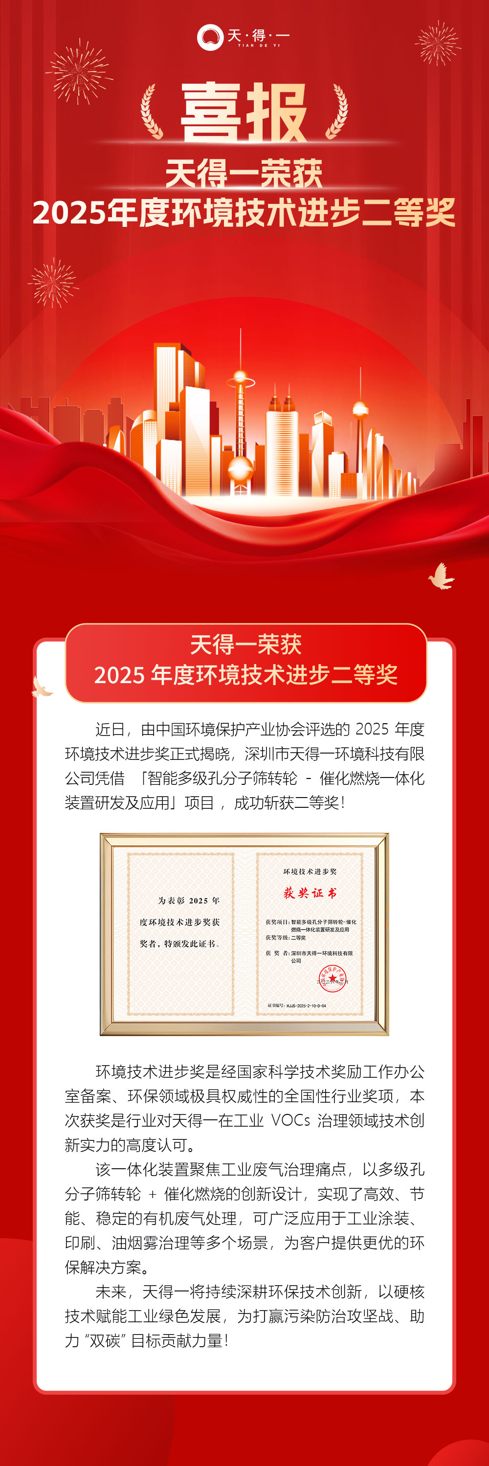 喜報 | 天得一榮獲 2025 年度環境技術進步二等獎!
